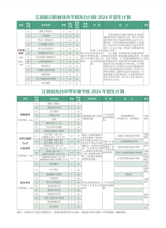 根据省教育厅、盐城市教育局通知精神,江苏联合职业技术学院东台分院五年制高职(大专)计划招生650人;江苏省东台中等专业学校计划招生1200人,其中职教高考班200人、中职与高职“3+3”分段培养160人、职业中专840人。(详见《招生计划表》)