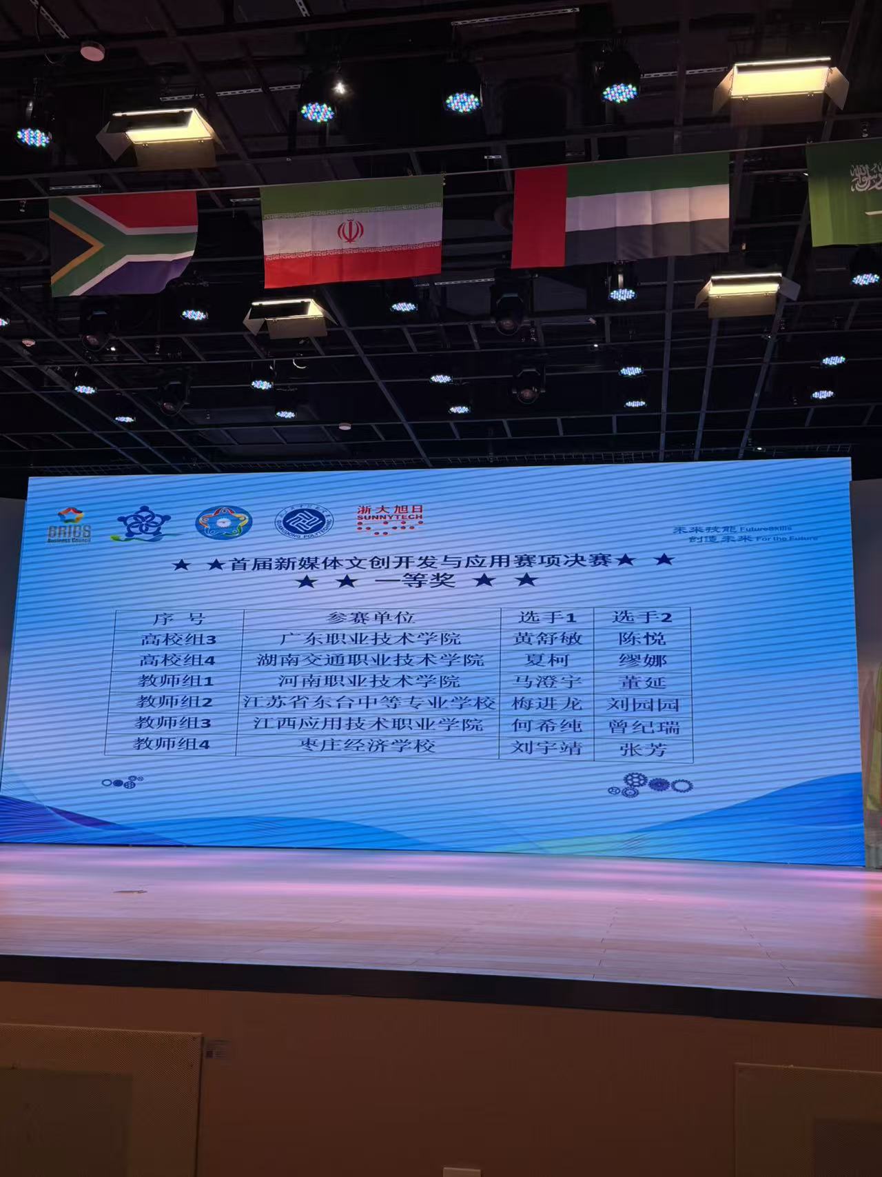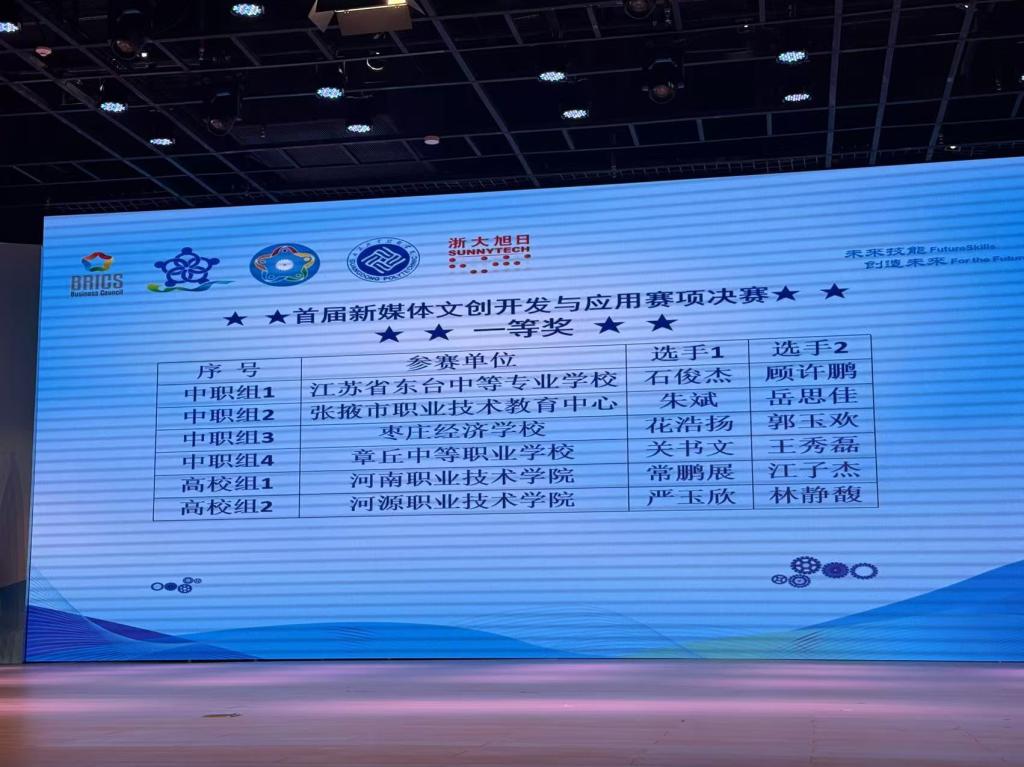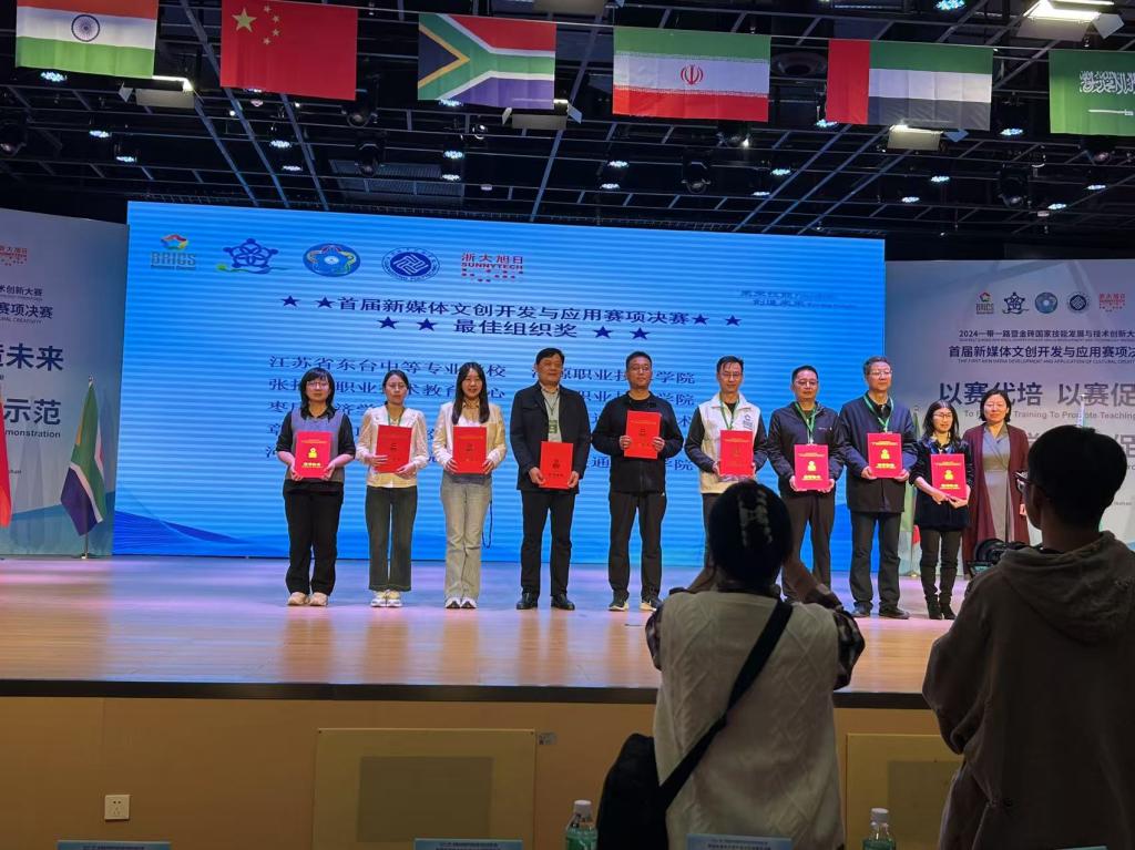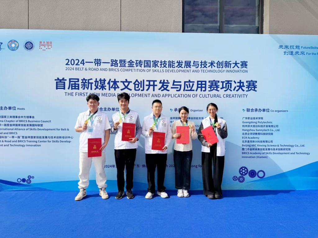 在2024“一带一路”暨金砖国家技能发展与技术创新大赛之首届新媒体文创开发与应用赛项决赛中,我校石俊杰、顾许鹏两名同学和刘园园、梅进龙两位老师凭借出色表现分别获中职组和教师组一等奖,学校获最佳组织奖。