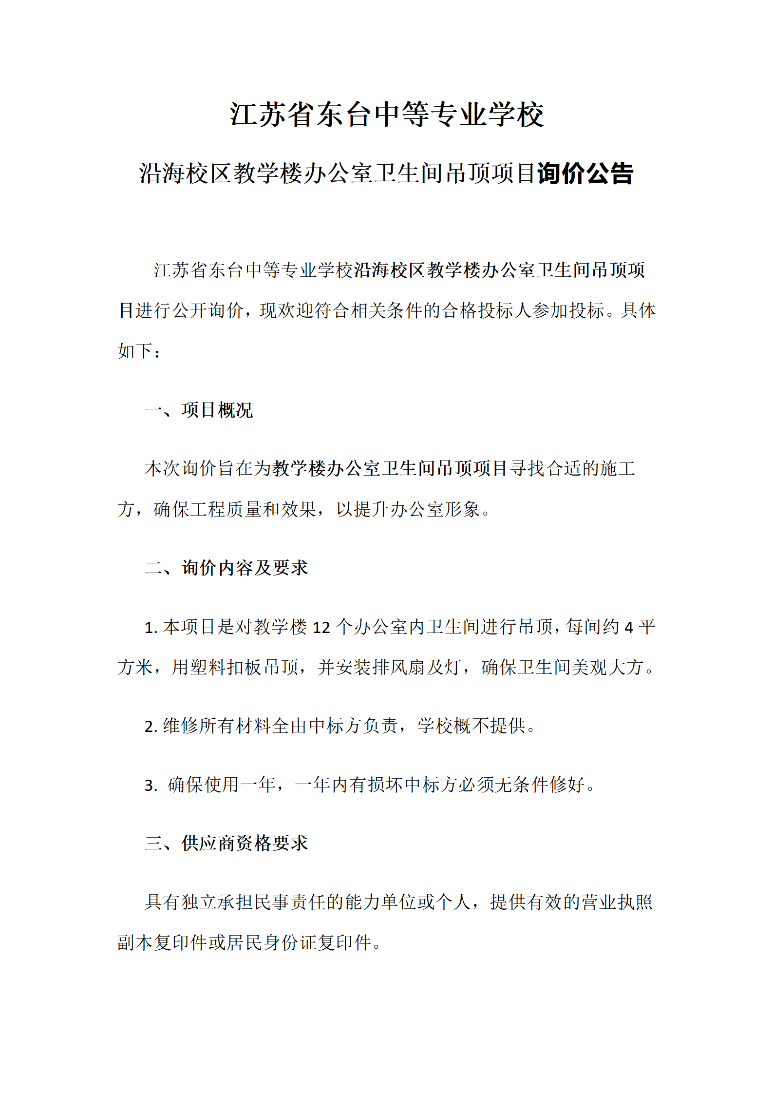【公示】沿海校区教学楼办公室卫生间吊顶项目询价公告