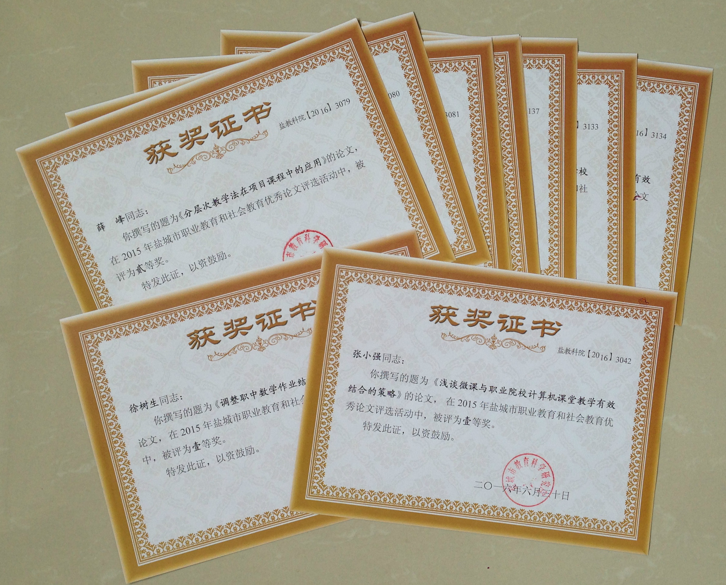 在刚刚揭晓的2015年盐城市职业教育与社会教育优秀论文评比活动中,我校多篇教师论文获奖,有三名老师获一等奖,五名老师获二等奖,四名老师获三等奖,成绩喜人,特此祝贺!希望更多的教师平时能多积累,多动笔,将自己的教育教学以及科研的经验成果写出来与大家一起分享,收获更多的荣誉!