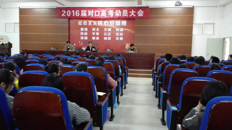 4月20日下午,东台中专2016届对口高考动员大会在校三楼会议室隆重举行。虞静东校长、崔世泰副校长、中职处周正奇主任及高三年级的全体同学和班主任参加了会议。会议由崔世泰副校长主持。