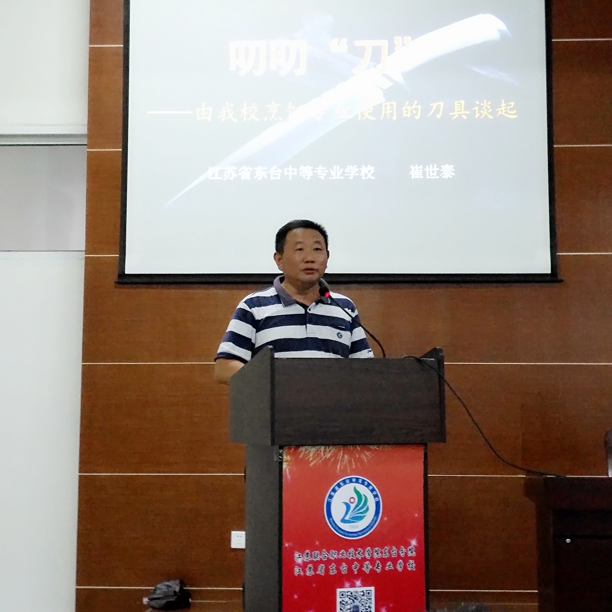 9月4日下午二节课下,江苏联合职业技术学院东台分院(东台中专校)台城校区三楼会议室座无虚席,所有教师早早就赶到这里,参加学校新学期的第一次政治学习。新学期,新气象,会议室的气氛有点不同往常,分管台城校区日常工作的副校长崔世泰同志没有像平时一样坐在主席台上,而是站在一侧的演讲台前,微笑着看着大家。他身后是投影仪的大屏幕,上面显示的是一个以厨刀为背景,题目为《叨叨“刀”》的画面。