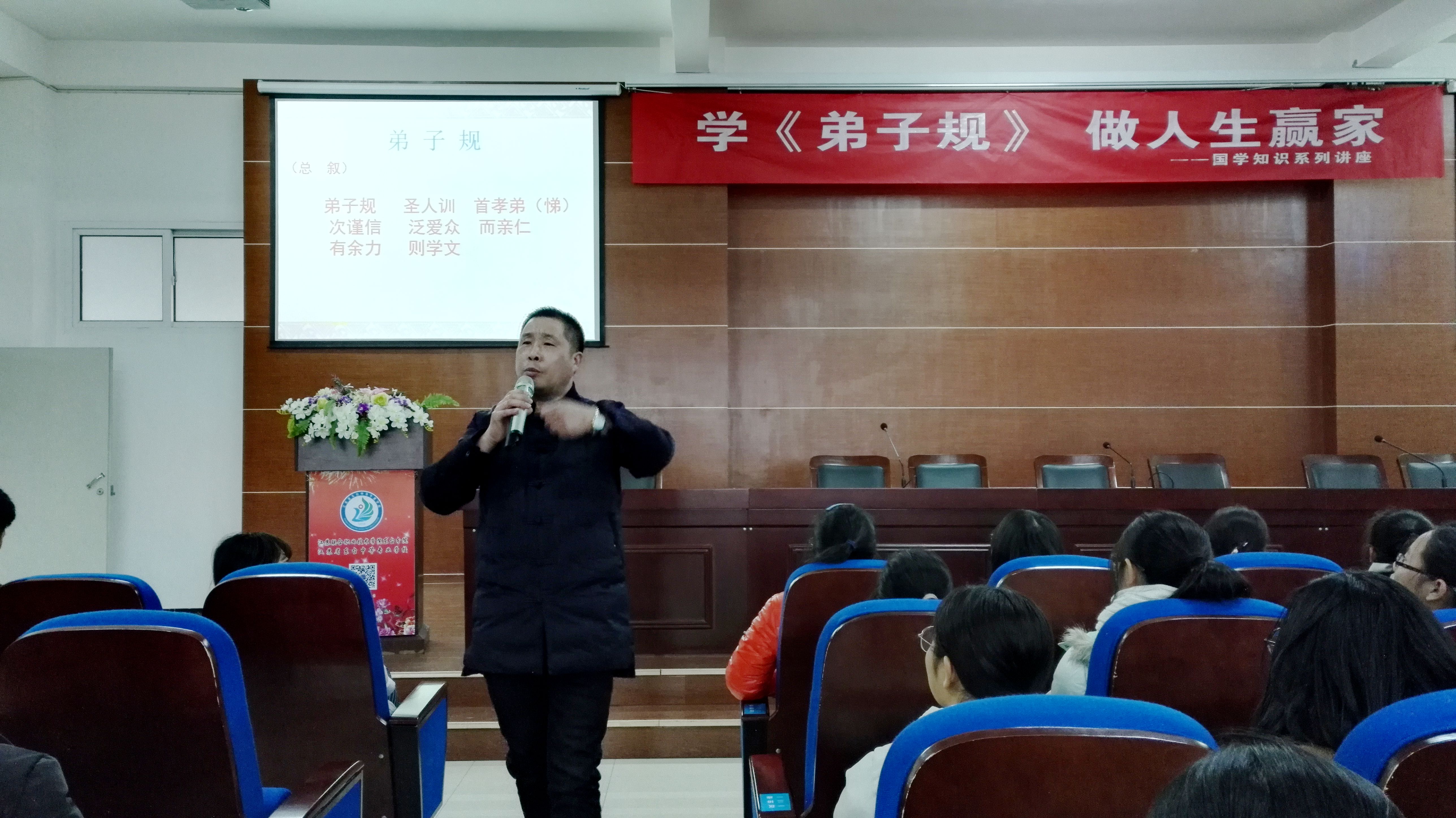 讲座由学校杨志龙老师主讲,他分别从《弟子规》的概述、孝敬篇、悌睦篇、谨慎篇、诚信篇、博爱篇、亲仁篇和学文篇谈起,全面阐述了学习《弟子规》的目的和重要意义,并针对目前学生在学习生活中存在的问题和困惑,指导学生通过《弟子规》的学习,掌握其精神内涵,将来能顺利地从校园走向职场,实现职业身份的转变。杨志龙老师风趣幽默的讲解,深入浅出的剖析,热情洋溢的互动,鲜活生动的举例,博得师生们阵阵热烈的掌声。他告诉同学们,要牢牢地把握当下,从身边的小事做起,“入则孝”、“出则悌”、重“谨信”、“泛爱众”、能“亲仁”、尽力“学文”。他告诉大家,当前我们正处在一个信息爆炸、科技发达、一日千里的巨变时代,这个时代充满挑战和机遇,是一个不折不扣的“3c”时代,即change、challenge和chance并存的时代,作为新时代建设者的当代中职生,要树立远大理想,心怀天下,要有壮怀激烈的勇气和抱负,要敢于担当和面对挑战,要切实把握当下的各种学习机会,扎实学好专业知识,丰富自己的文化基础,积极发挥自身的优势,以饱满的热情和昂扬的斗志,投身于伟大中国梦的实践中去。他说,国学是中华民族几千年来形成的传统文化与学术的总的概括,是中华民族的文化之根、民族之魂。振兴和弘扬国学,对于唤起民族文化自觉,增强文化自信,实现文化认同,凝聚民族精神有着重大的意义。他要求同学们不仅要学习国学和传统文化,更要做国学和传统文化的传播者,践行者,让国学精神启迪人生、浸润心灵,引领成长。
